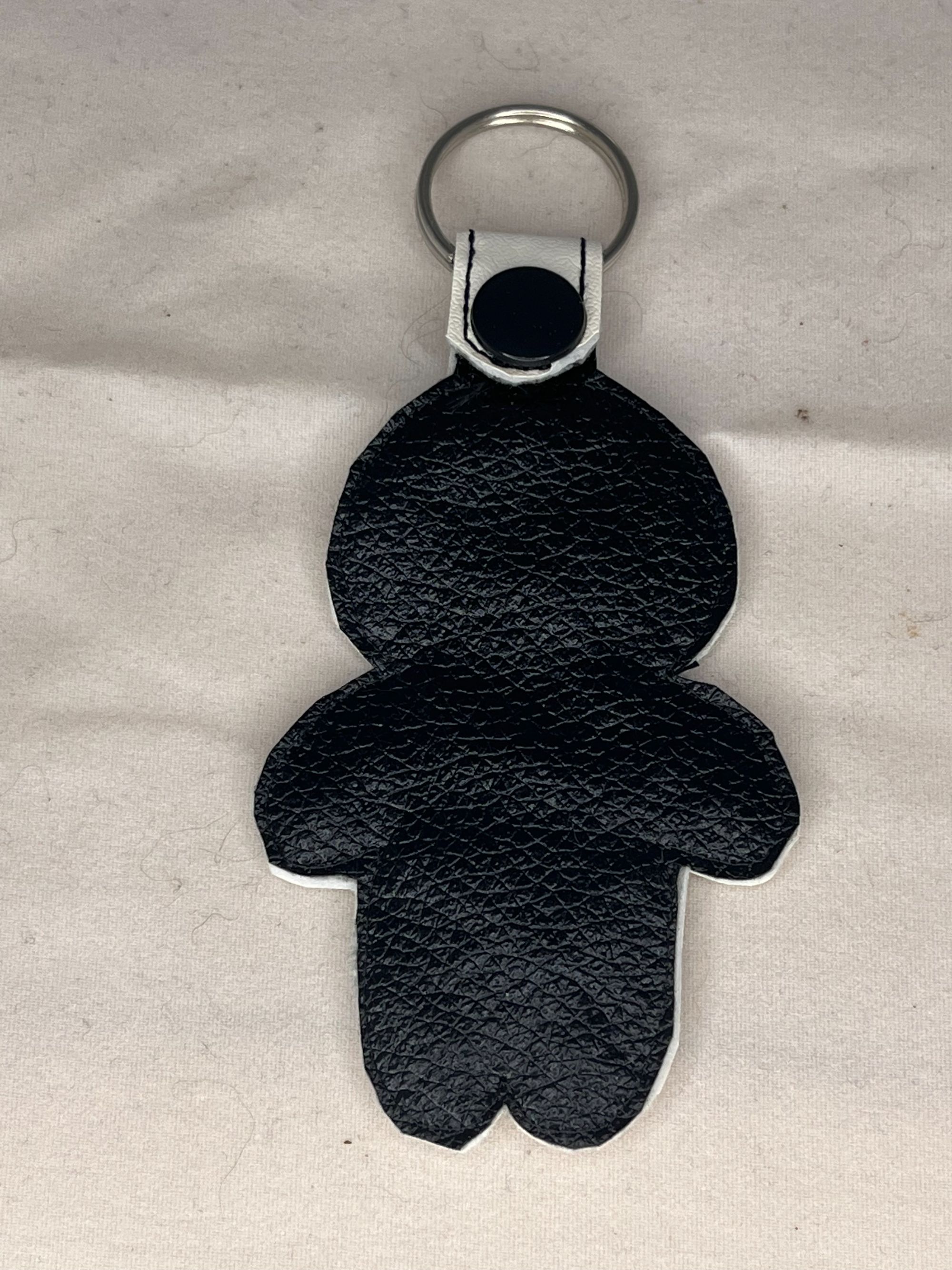 This is a Skelton snap tab/ keychain. it measures approximately 4.5 inches from top of ring to bottom and 2.25 inches at widest point. it come in 2 versions, white with black stitching or black with white stitching. the heat is always red. when choosing color, it will be for the vinyl color, and we will match the stitching.