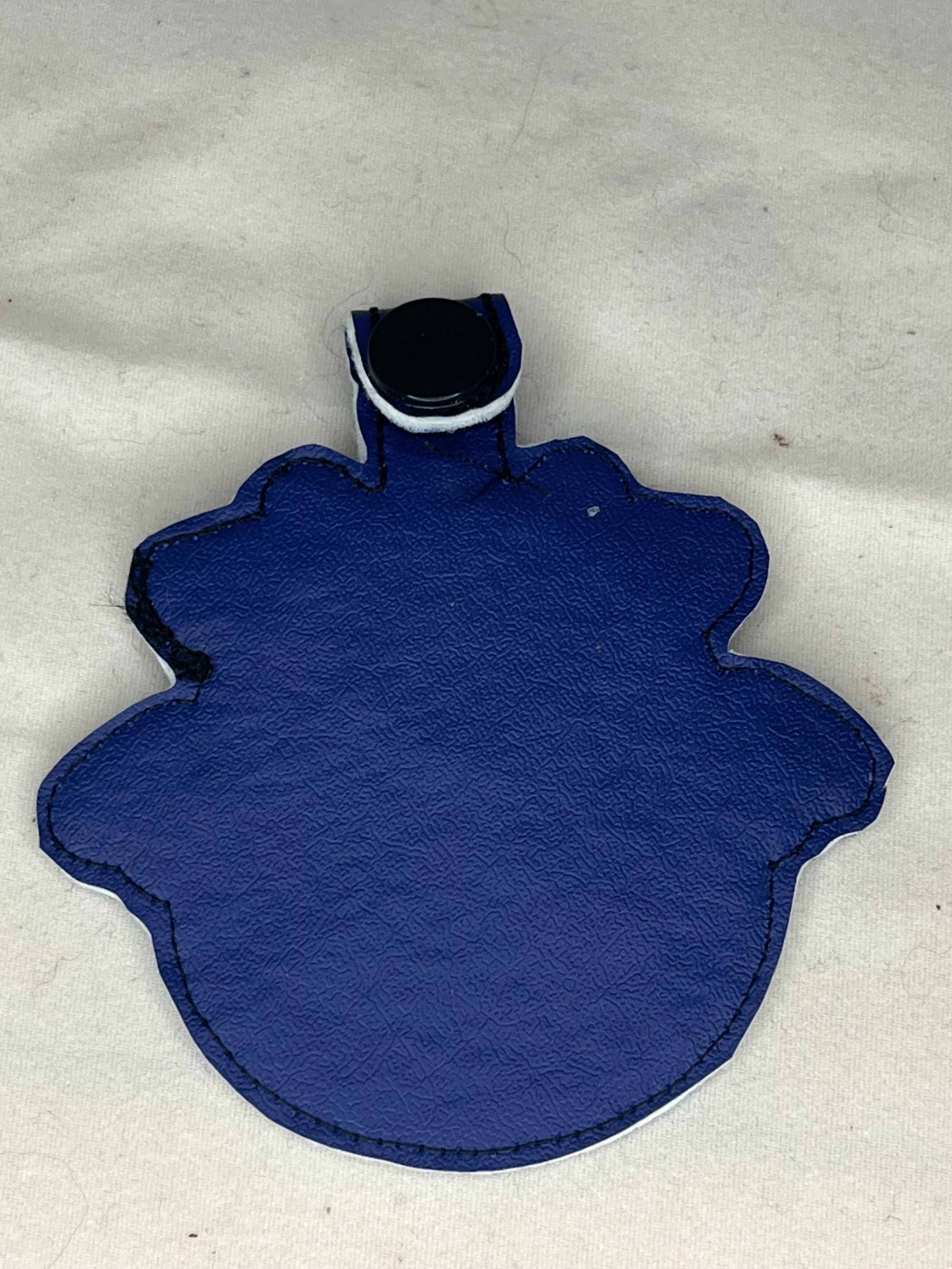 Embroidered Squish Dragon snap tab / keychain. It is made of Midnight blue vinyl and measures approximately 3inches by 3.75 inches.